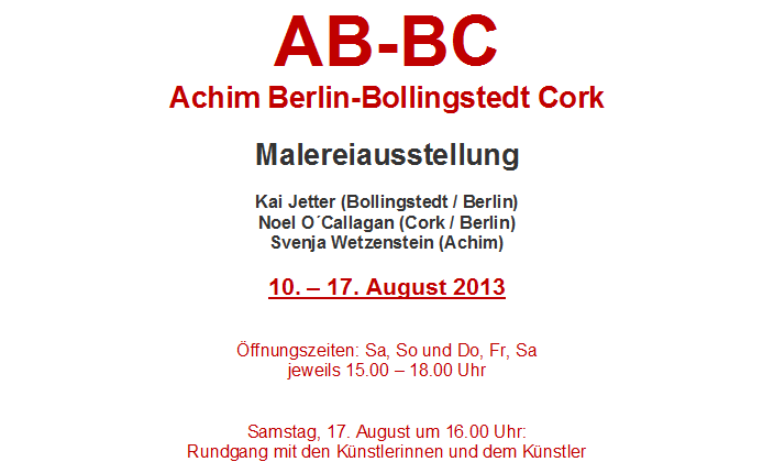 Home | Informationen zur aktuellen Ausstellung | Kai Jetter | Noel O´Callaghan | Svenja Wetzenstein | Die Galerie Beekholt | Malereiausstellung 2011 Impressionen | Kontakt | Links | Impressum | Sitemap